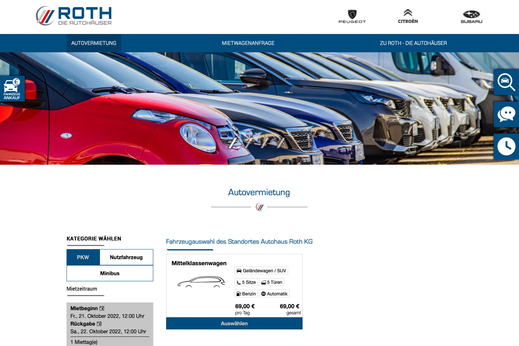 Auch das neu geschaffene Angebot Autovermietung haben wir für das Autohaus Roth auf einer externen Webseite umgesetzt. Die Mietwagen Seite ist unter der Domain www.miet-bei-roth.de zu finden.